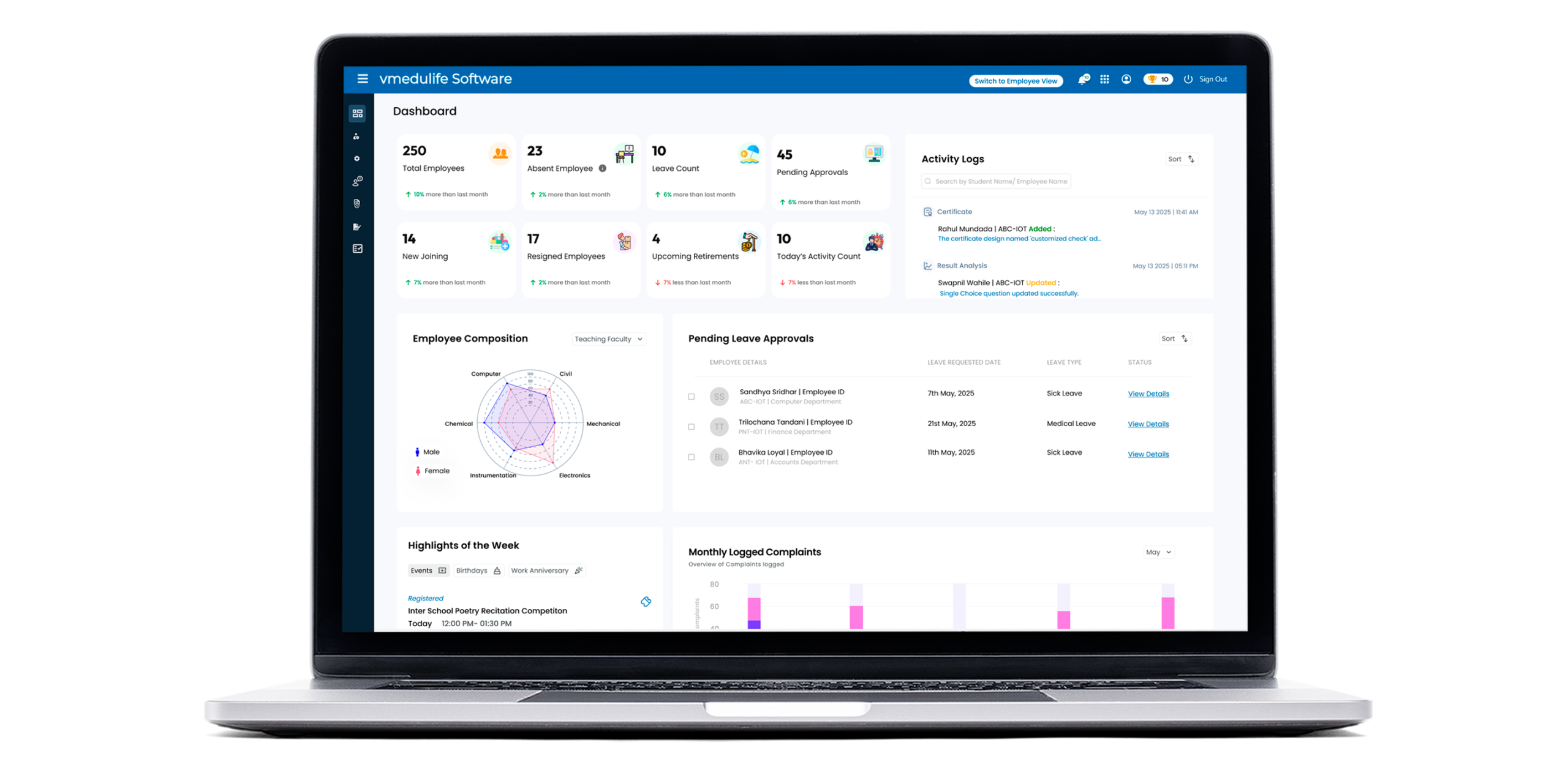 Traditional HR processes—leave approval, payroll calculation, workload tracking—consume too much administrative time. vmedulife HRMS digitizes every HR workflow and maintains a transparent record of faculty & staff activities.