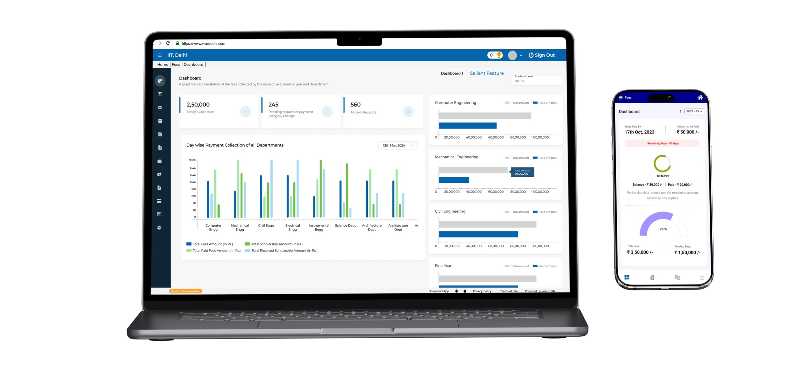 vmedulife Fees Management Module ensures 100% accuracy in fee collection, receipt generation, due tracking, concessions, and reporting. Students and parents can instantly pay fees online, reducing queues and delays.