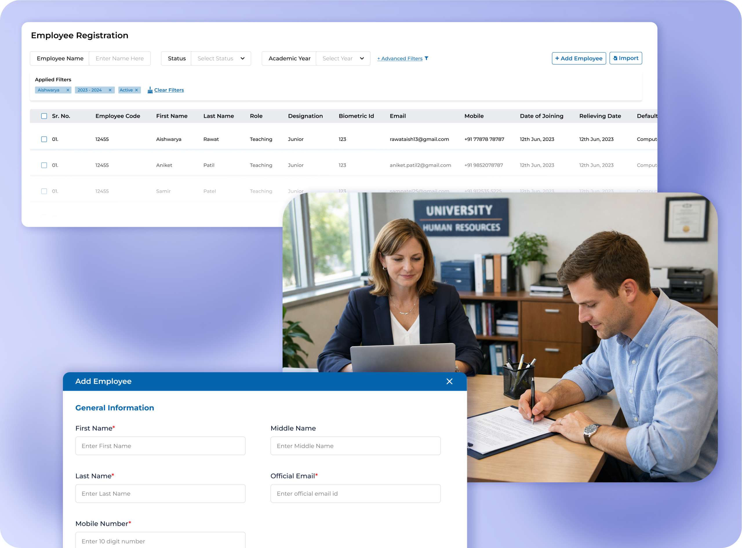 - Centralized employee registration for teaching and non-teaching staff