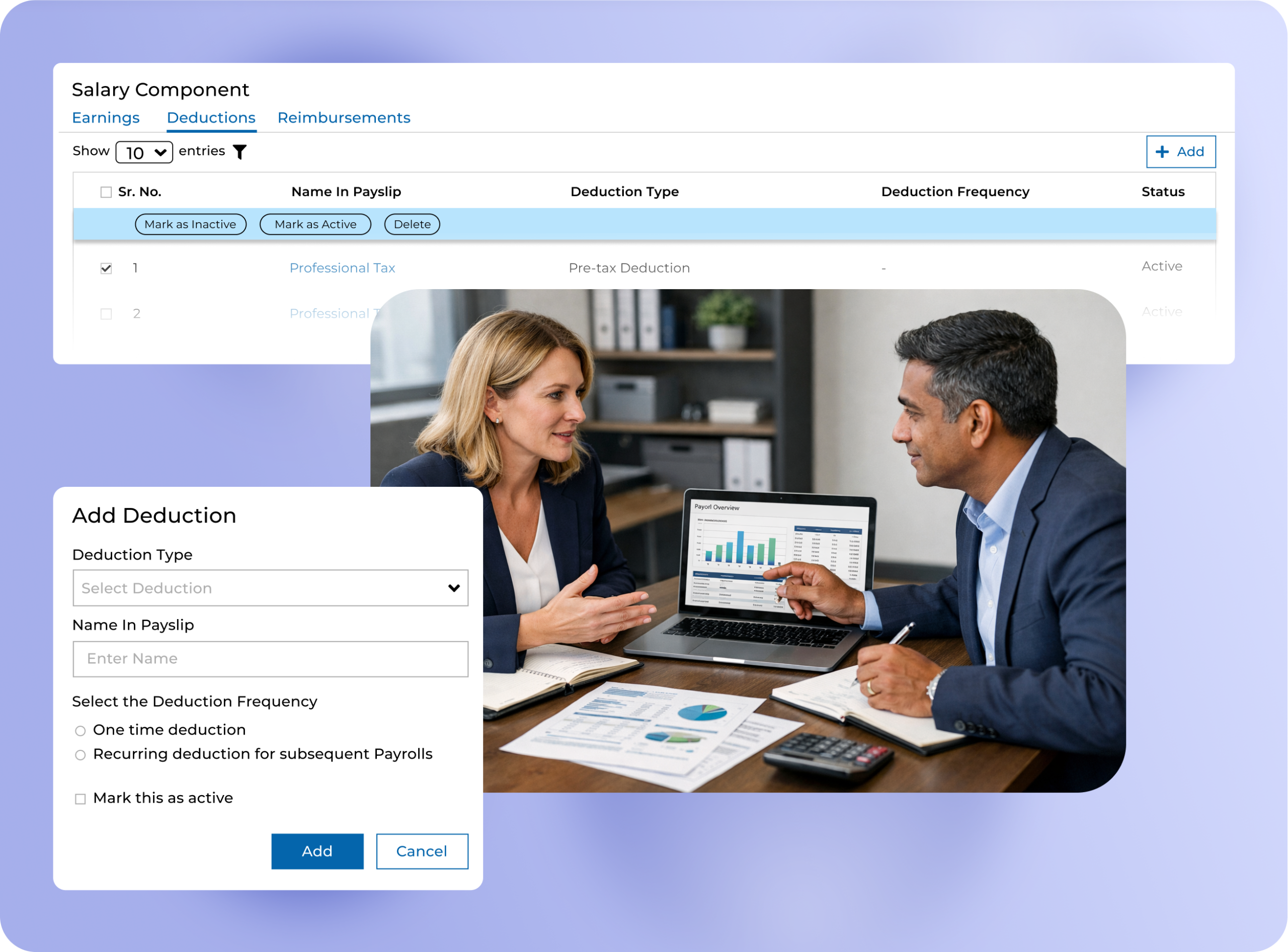 - Configurable salary earnings, deductions, and reimbursements