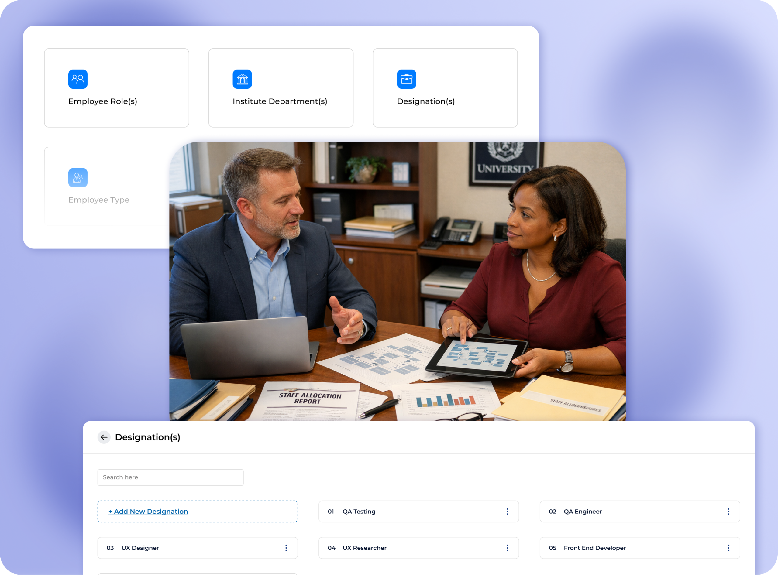 Organize institutional workforce structure with clearly defined roles, designations, and departmental mapping.