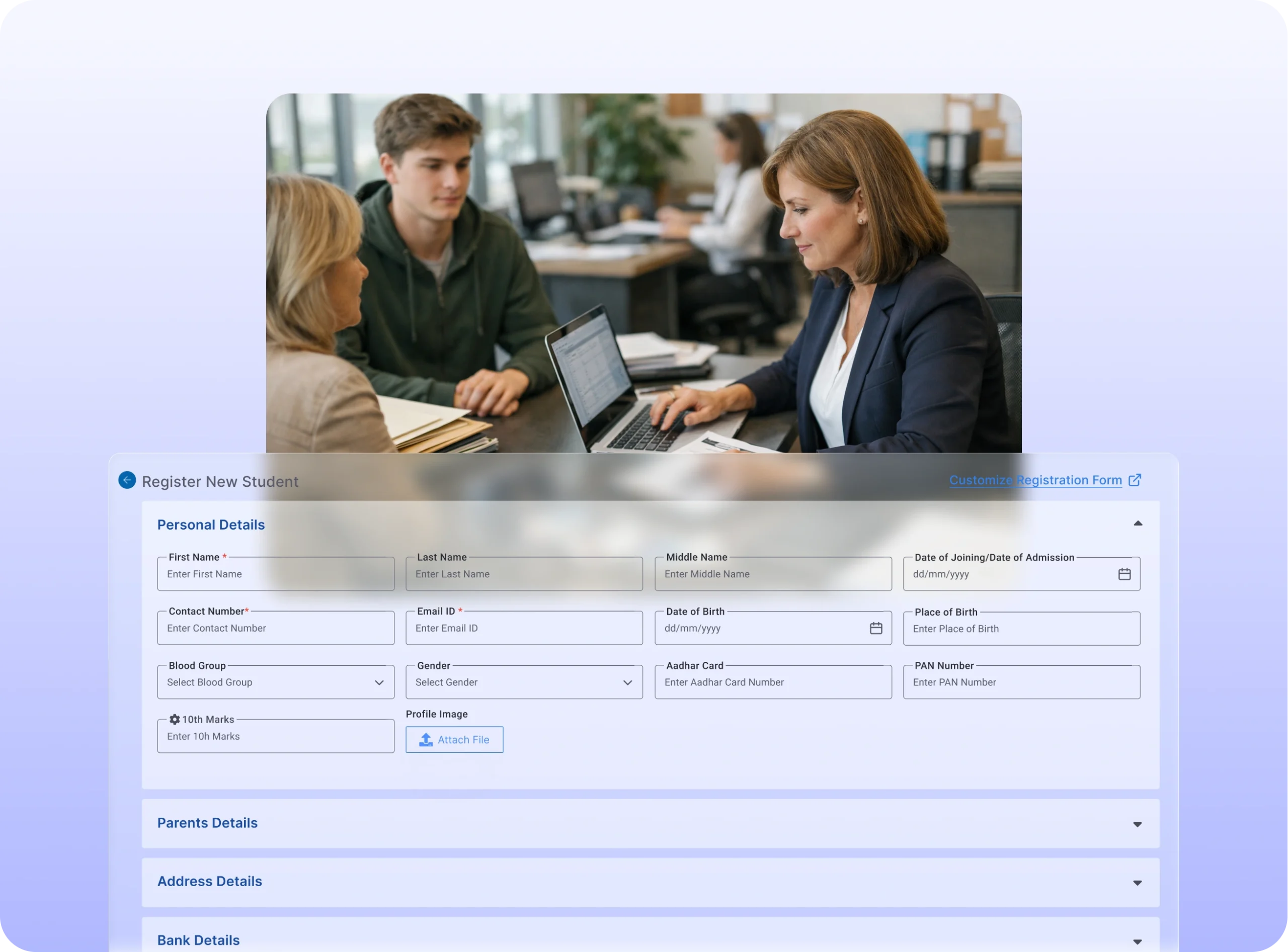 Design flexible admission and enquiry forms tailored to institutional processes.