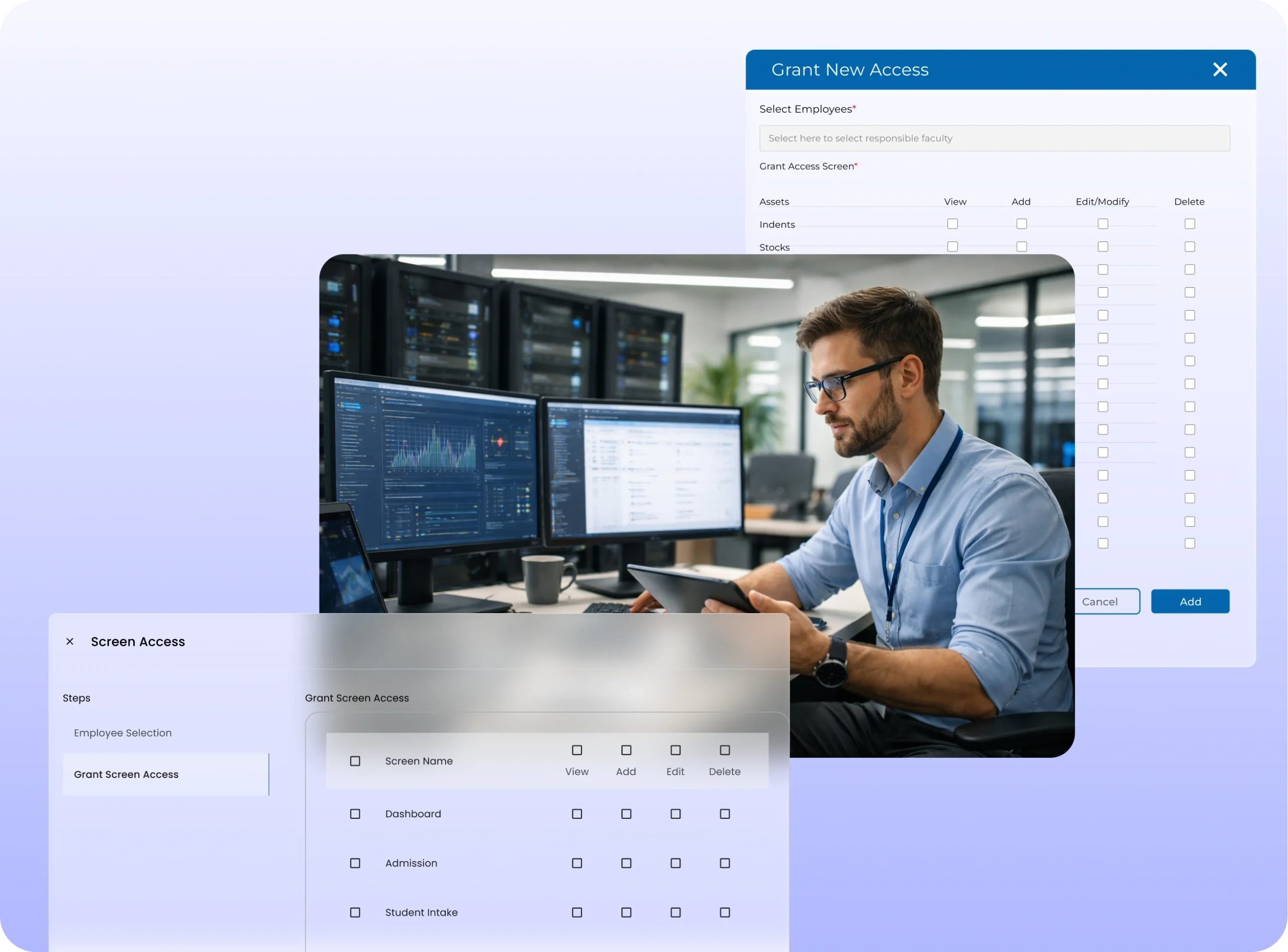 - Control permissions for modules and data access