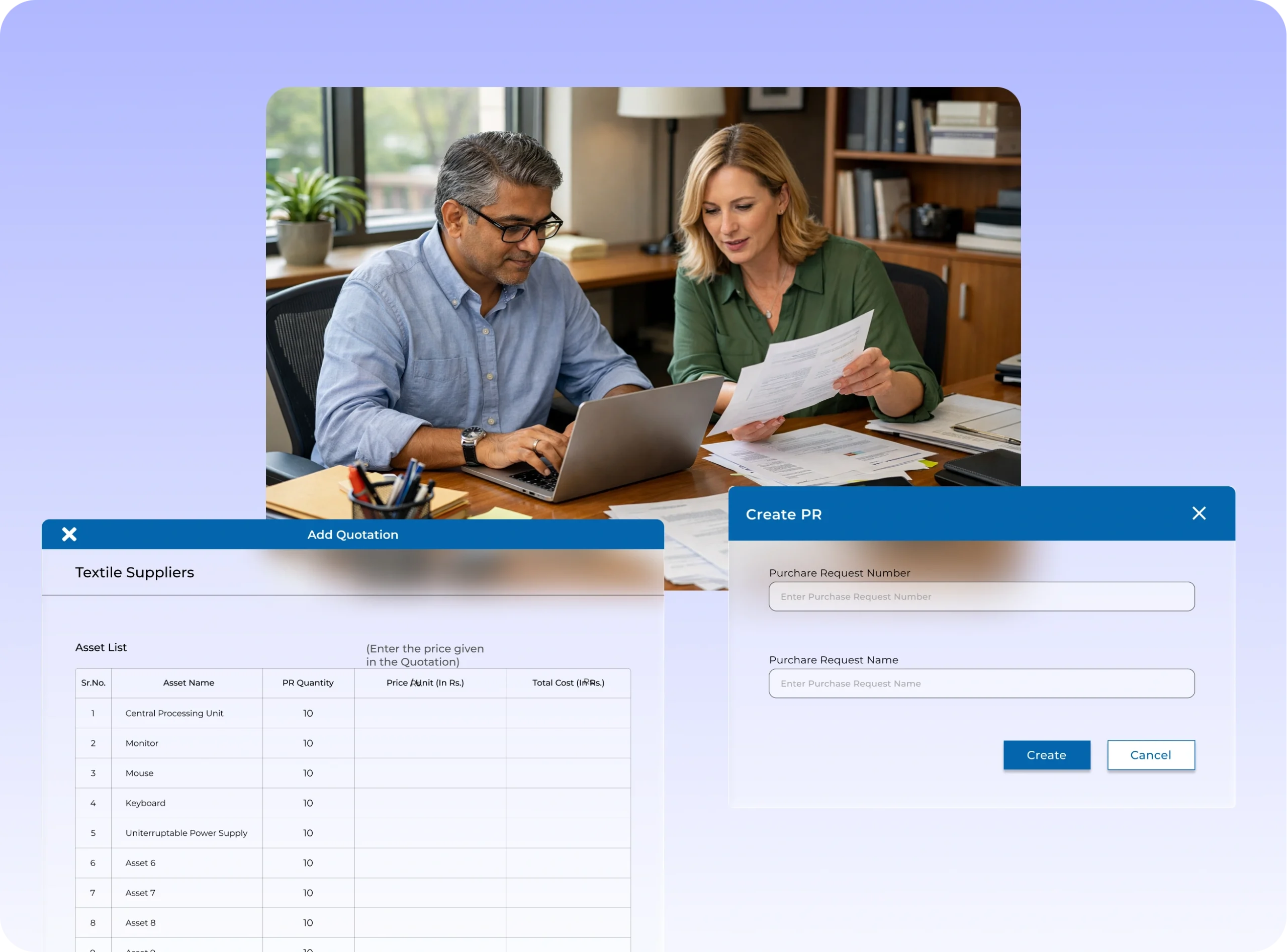 Standardize procurement requests with approval routing and quotation comparison.